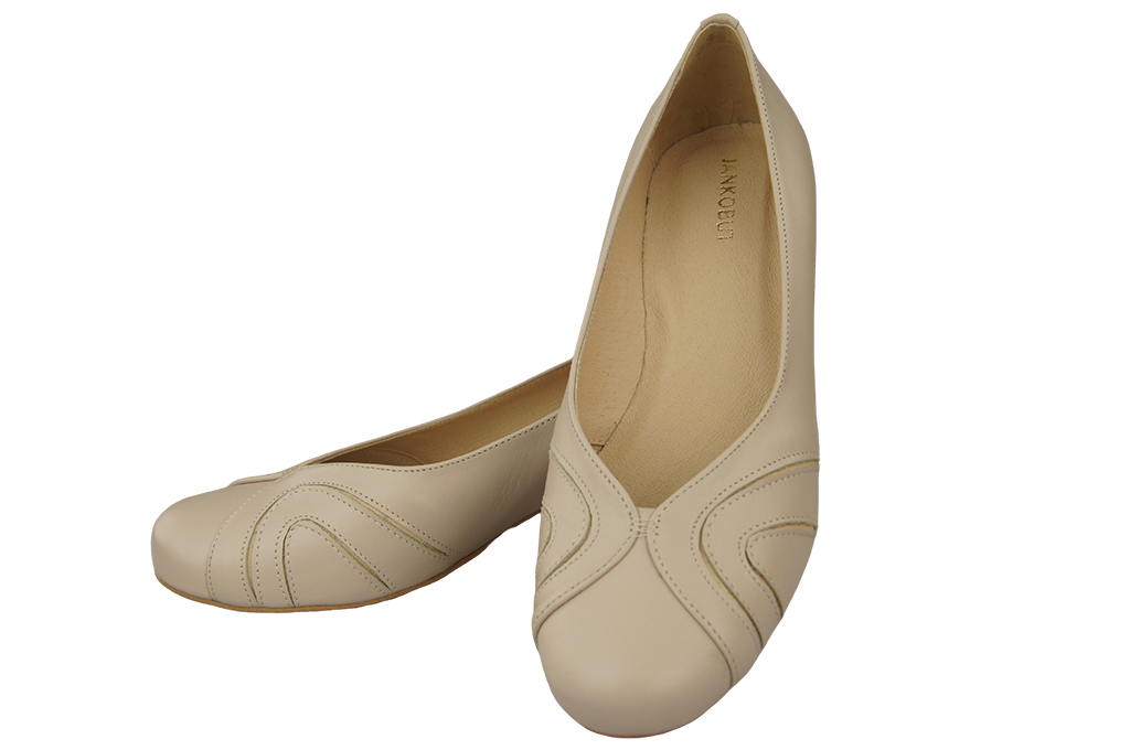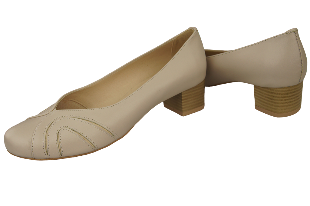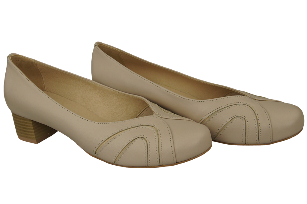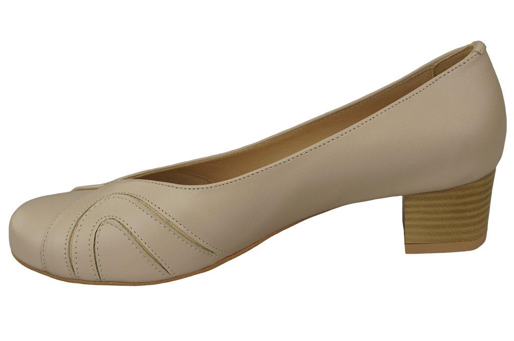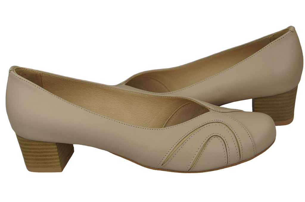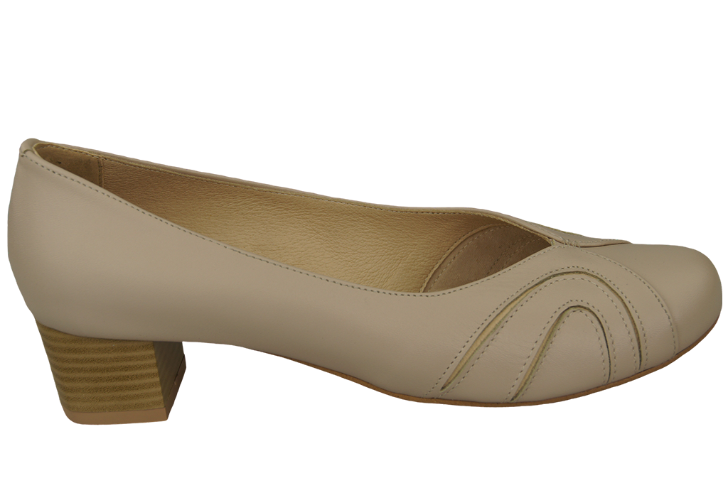 - Stability and support for the feet is ensured by a perfectly contoured low heel covered with natural leather.