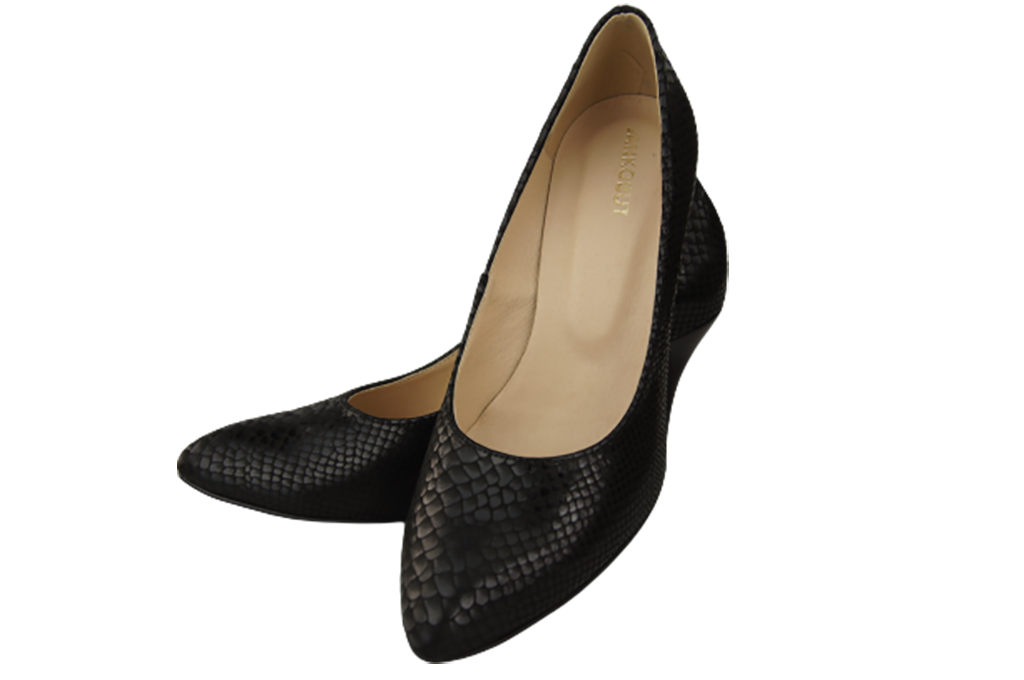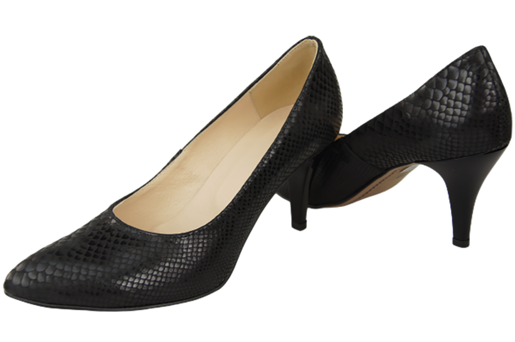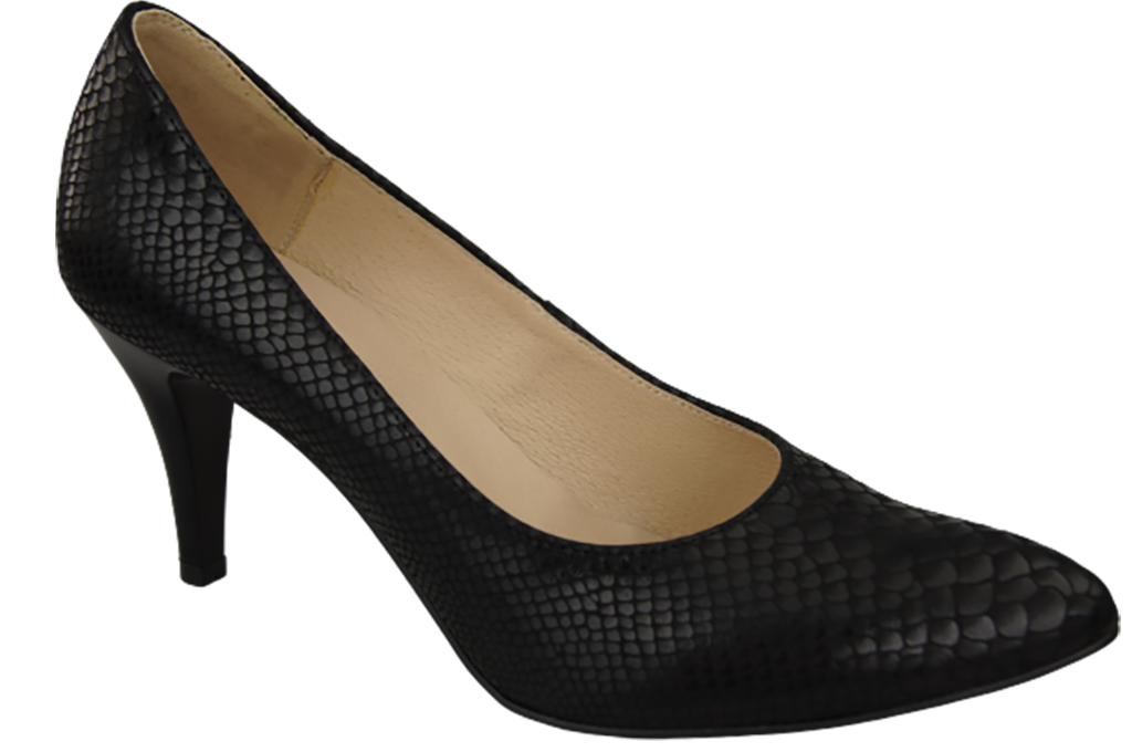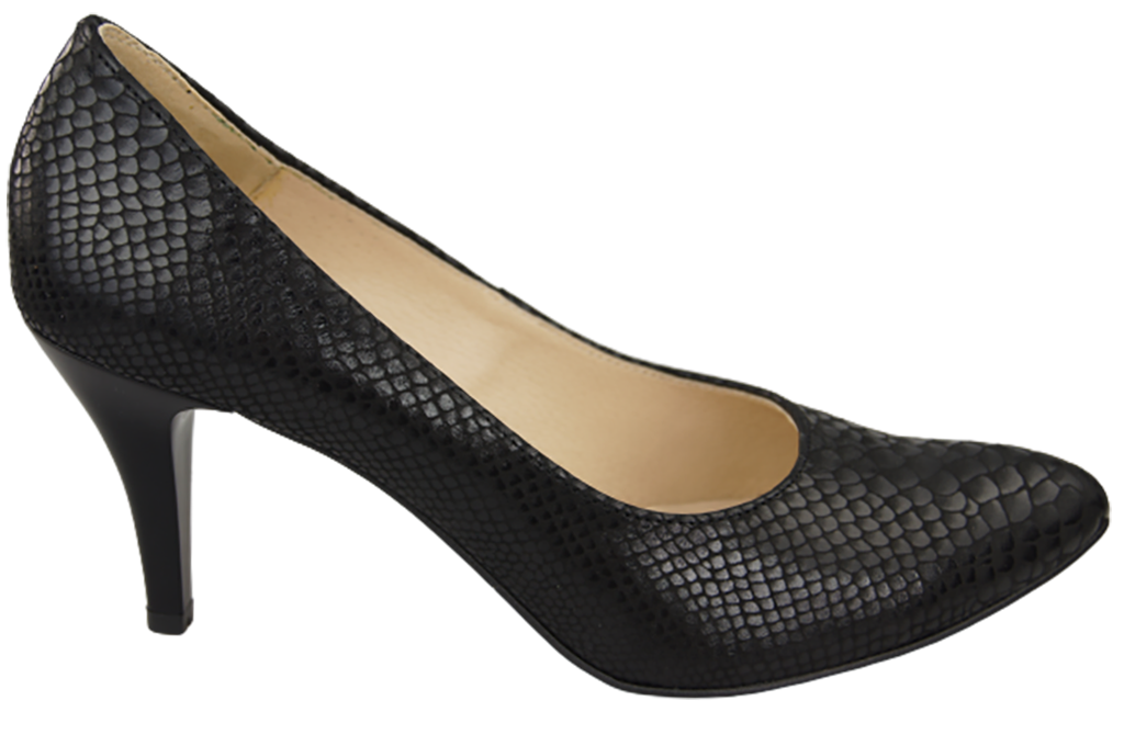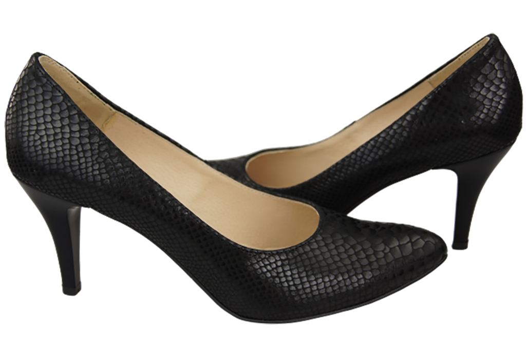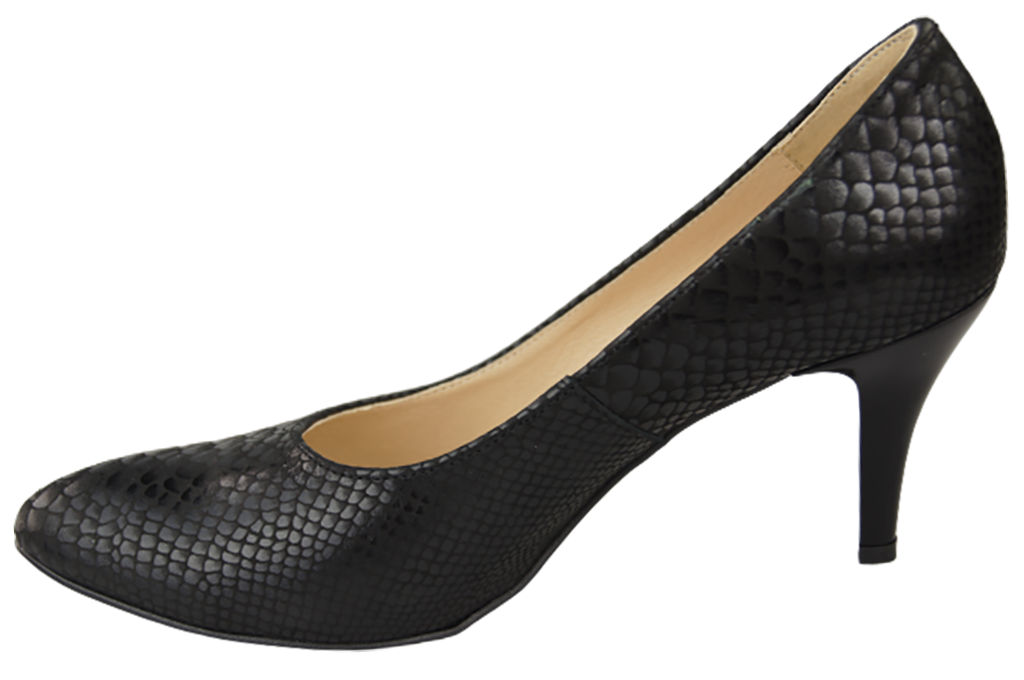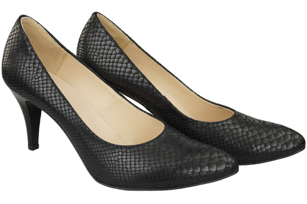 - Women's pumps made of high-quality natural embossed leather delight with a fashionable pattern imitating snake skin, thanks to which the classic cut acquires a modern, intriguing character.