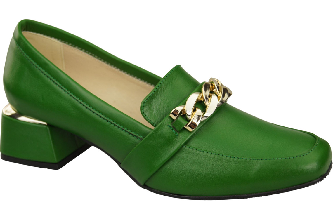 - Shoes set on a low, wide heel guarantee comfort of use and a stylish look.