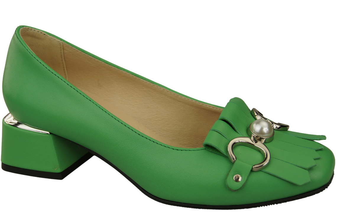 - Women's pumps made of natural grain leather with flat heels are an elegant and very comfortable cut.