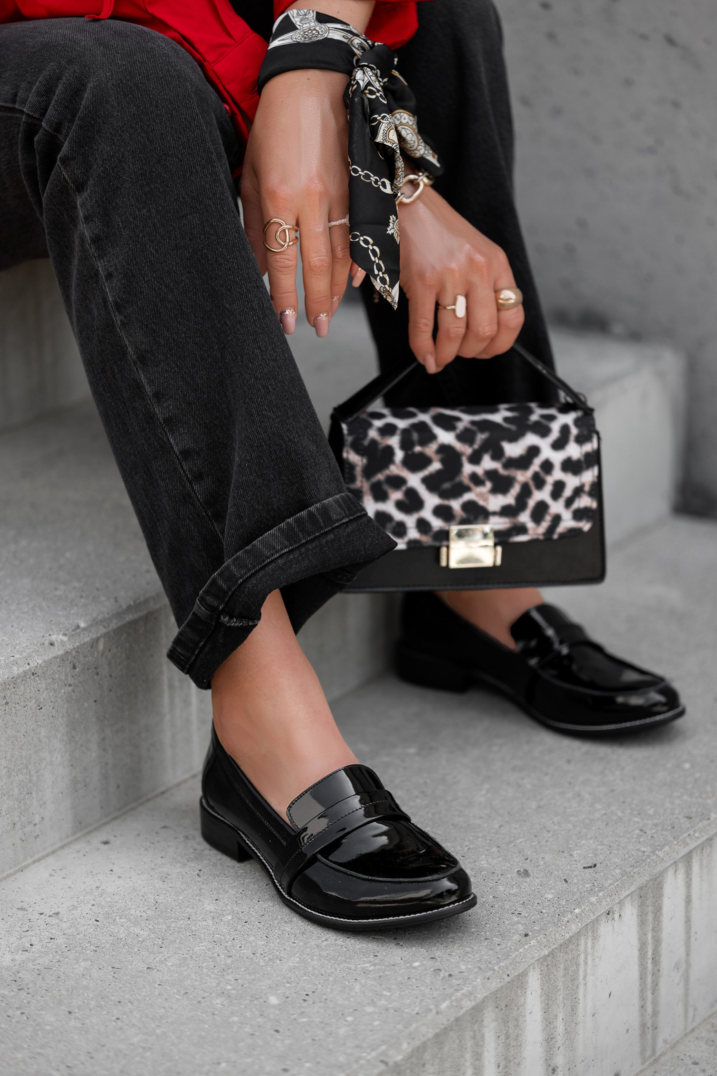 - Modny, a zarazem wygodny fason wykonano w połyskującej, lakierowanej skórze