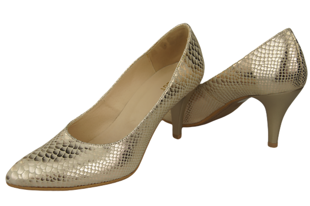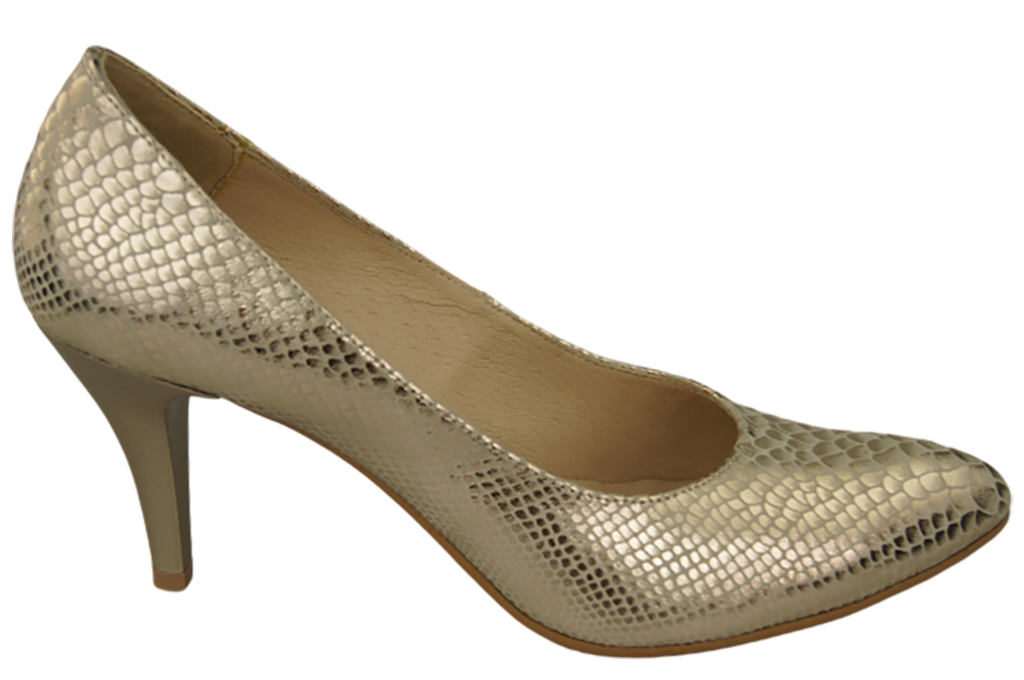 - Czółenka damskie wykonane z wysokiej jakości skóry naturalnej tłoczonej zachwycają modnym wzorem imitującym skórę węża, dzięki któremu klasyczny krój zyskuje nowoczesnego, intrygującego charakteru.