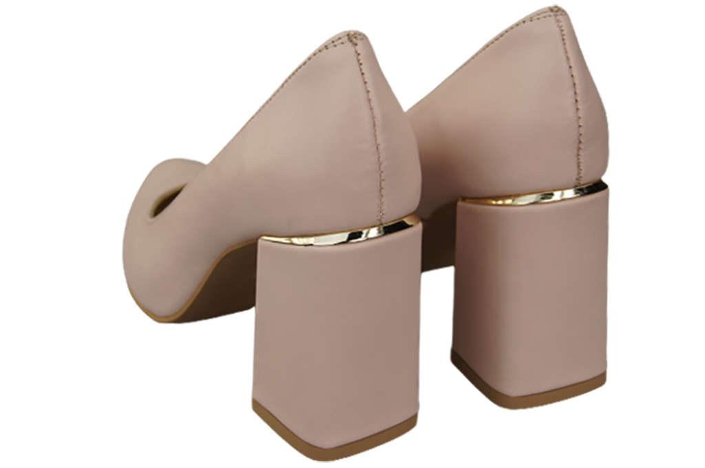 - Całość dopełnia szeroki oblekany skórą obcas wzbogacony złotą wstawką.