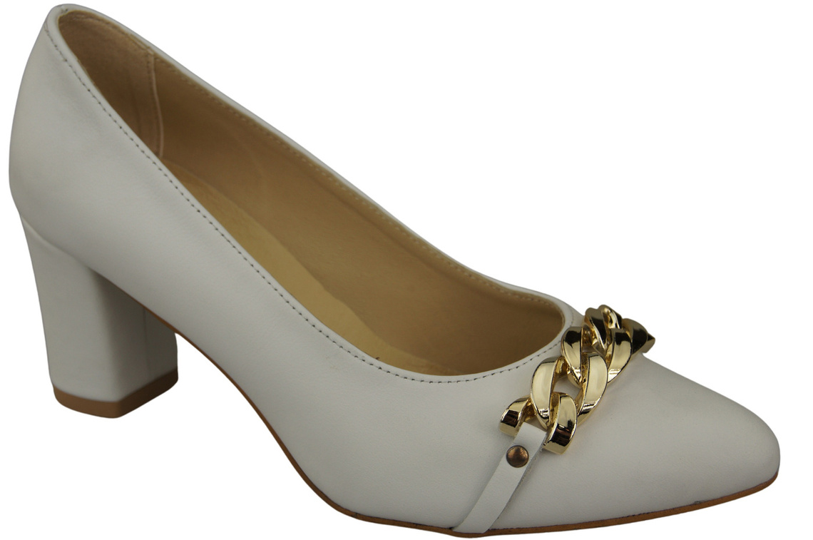 Klasyczne Buty Czółenka Damskie Białe z Naturalnej Skóry z Złotym Ozdobnym Łańcuchem 200 ElitaBut