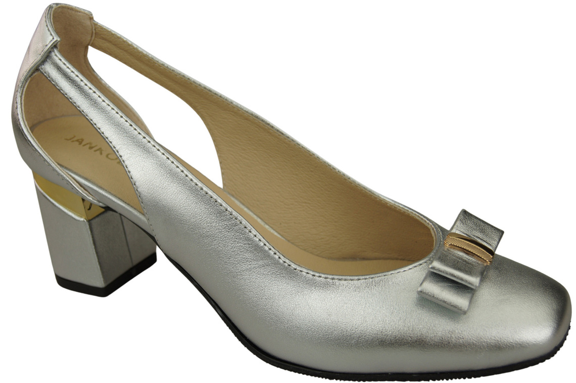 Buty Czółenka Damskie Srebrne z Naturalnej Skóry z Ozdobnym Obcasem 199 ElitaBut