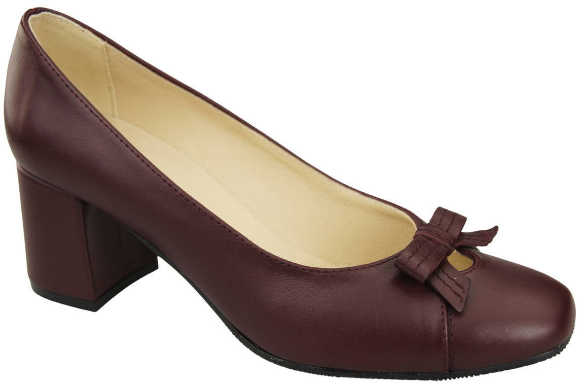 Czółenka Damskie z Kokardką Bordowe Skóra Naturalna i Niski Obcas 203 ElitaBut