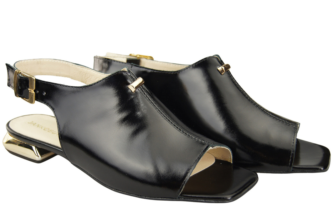Wygodne Obuwie Damskie Sandały Czarne Błyszczące Płaski Złoty Obcas Skóra naturalna 207 ElitaBut