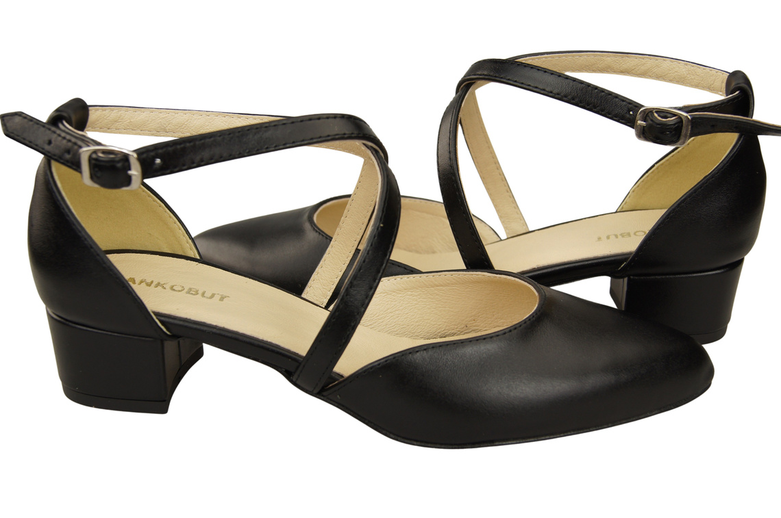 - Niski, stabilny obcas powleczony skórą – wygoda i pewny krok.