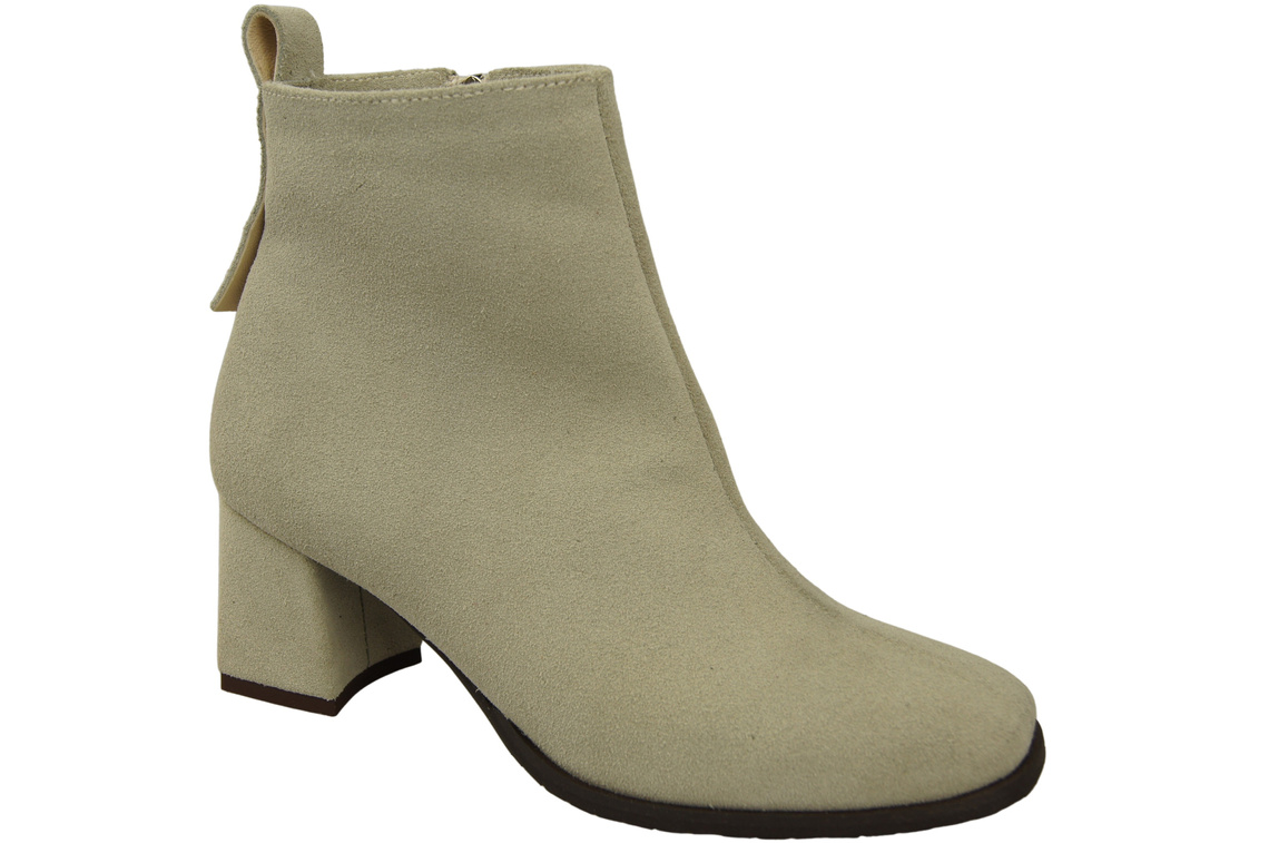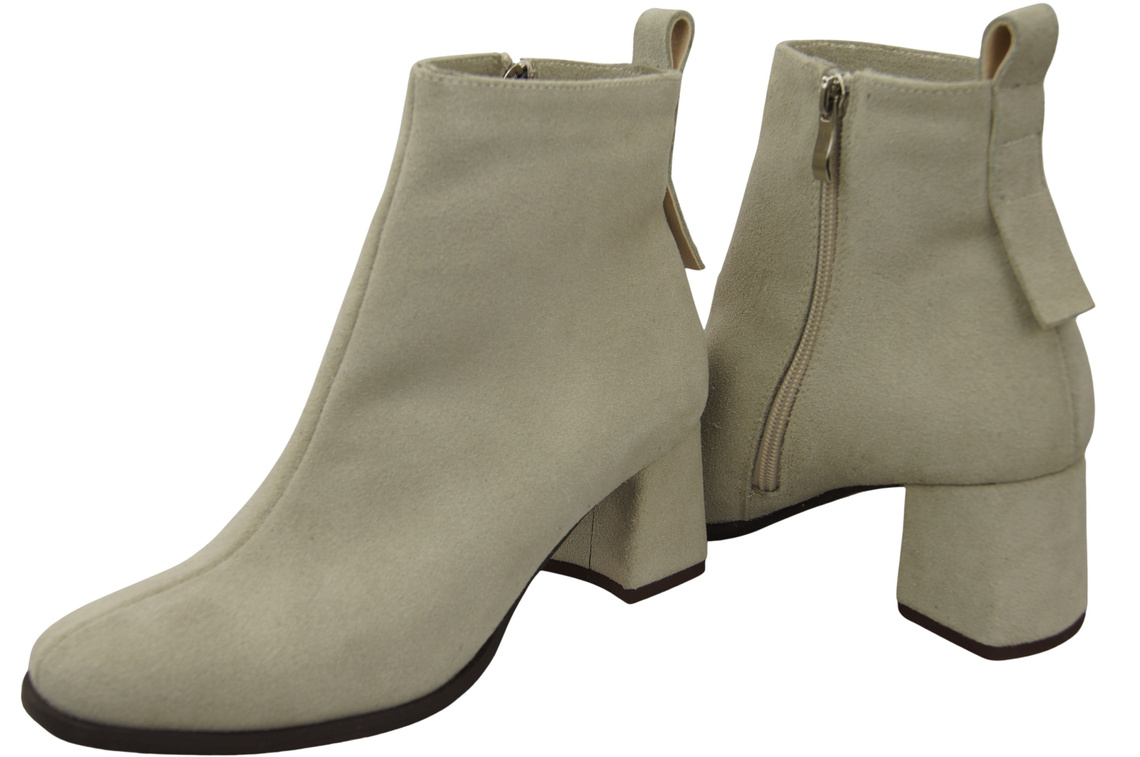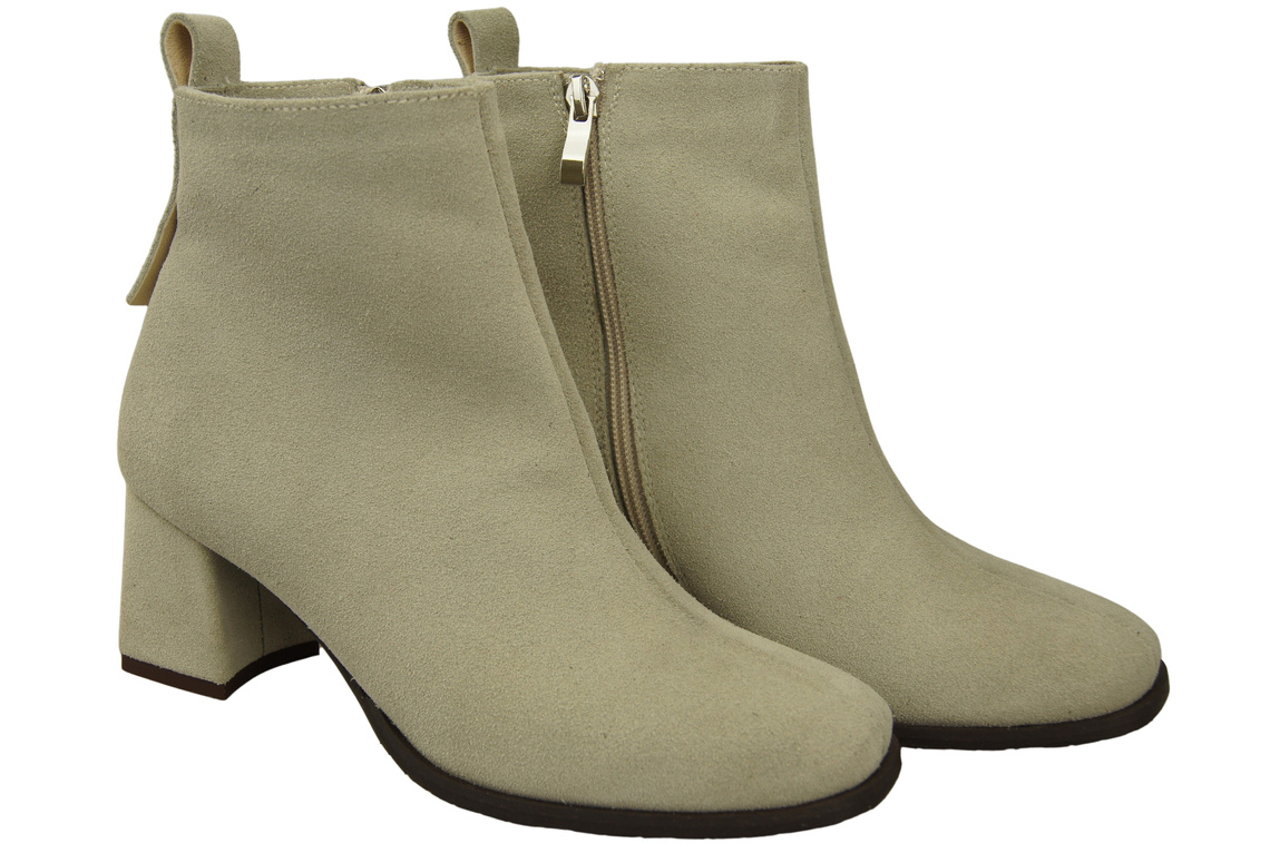 Botki Damskie Beżowe ze Skóry Naturalnej Welurowej na Stabilnym Słupku z Zamkiem 224 ElitaBut
