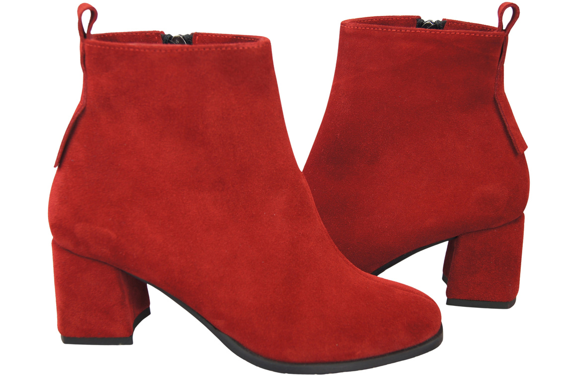 Botki Damskie Czerwone ze Skóry Naturalnej Welurowej na Stabilnym Słupku z Zamkiem 224 ElitaBut
